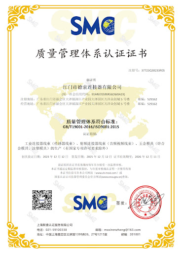 追求卓越品质,筑牢行业根基。江门市德索连接器有限公司具备ISO9001:2015 / GB/T19001-2016 质量管理体系认证资质。这标志着公司在管理规范化、服务标准化及产品品质国际化进程中迈出了坚实的一步!